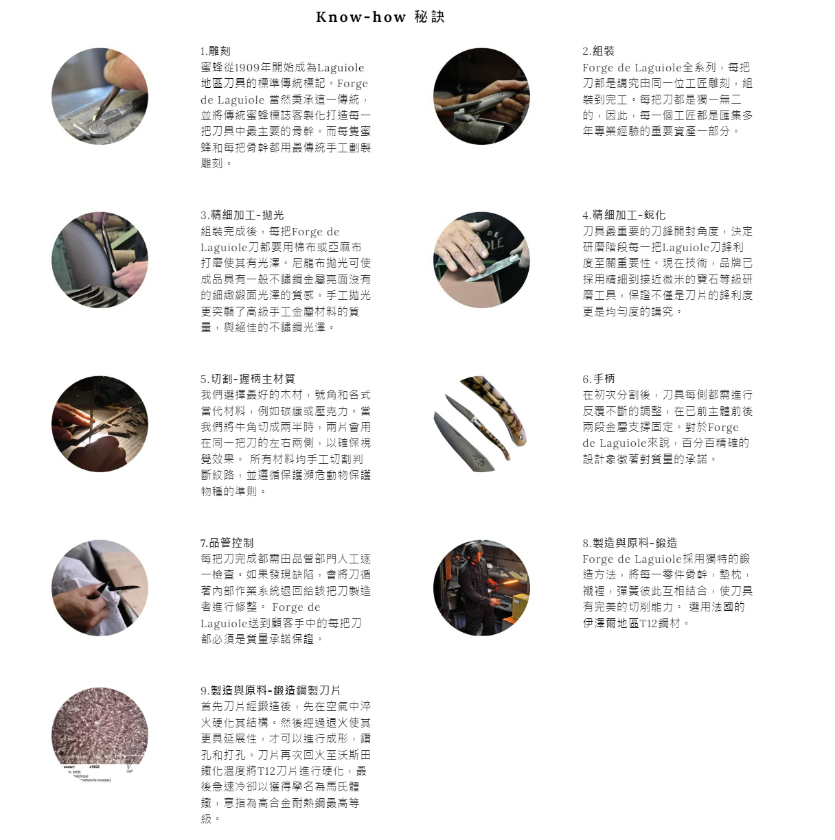 每一把刀的不僅鑲坎技術乃至料都是傳承下來的技藝經驗。無與倫比的質量和使用壽命,成就Forge de Laguiole®成為世界最出色的廚師和侍酒師以及美麗刀具愛好者指定的品牌。
