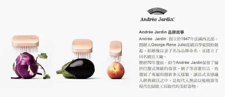 Andrée Jardin創立於1947年法國西北部,埃爾德河畔的南特,他的創辦人George-Rene Julio從刷具學徒開始做起,在結婚後以其妻子的名字為品牌命名,並創立了Andree Jardin刷具工廠。在經過七十年的經營,Andree Jardin不單單只生產基礎的掃除工具,它有了屬於自己的樣貌,依人們生活所需逐漸多元,從清潔用的馬桶刷、牙刷、衣料刷、蔬果清洗刷、萬用清潔刷和掃帚,或者是梳子、化妝刷,刷具變得多樣化。