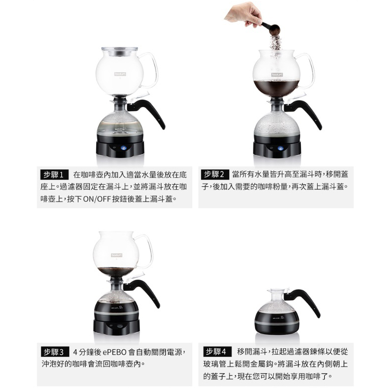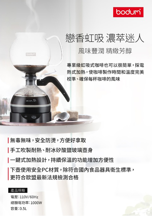 bodum虹吸式電動咖啡壺採電熱式加熱方式,使咖啡製作時間和溫度完美校準,確保每杯咖啡的風味。