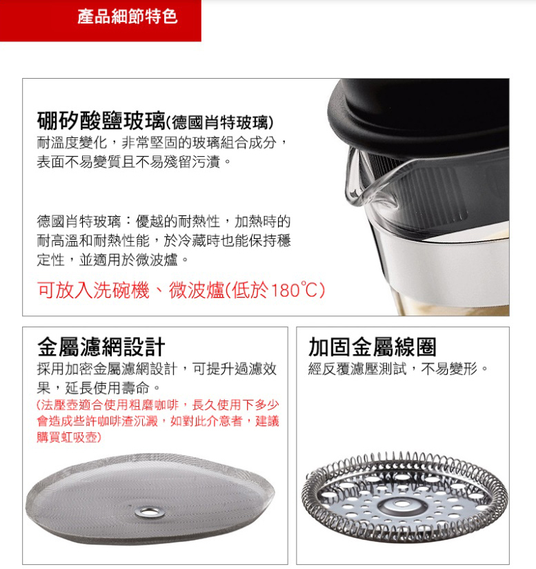 304不鏽鋼+德國肖特玻璃(硼矽酸鹽玻璃)的濾壓壺快速有效地帶出粗磨豆的味道,每次都能生產出美味的咖啡,耐熱的硼矽酸鹽玻璃不會改變或損害咖啡的天然味道,不鏽鋼柱塞可防止咖啡渣倒出時咖啡渣溢出。框架和蓋子由不鏽鋼製成,黑色CHAMBORD®聚丙烯手柄採用霧面處理,不僅在使用時提供舒適的抓握,還增加了經典的設計品質。