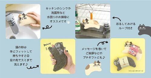 由閃閃發光的可愛動物製成的海綿,適合用在廚房水槽和洗手間。環狀纖維徹底去除水垢和污垢。附有懸掛環,貓的形狀適合您的手,易於握持。甚至可以用腳尖清潔污垢。
