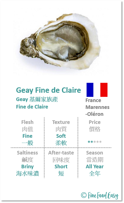 充滿大海及海岸土壤氣味,口感精巧適中,法式海鮮盤的經典蠔款。