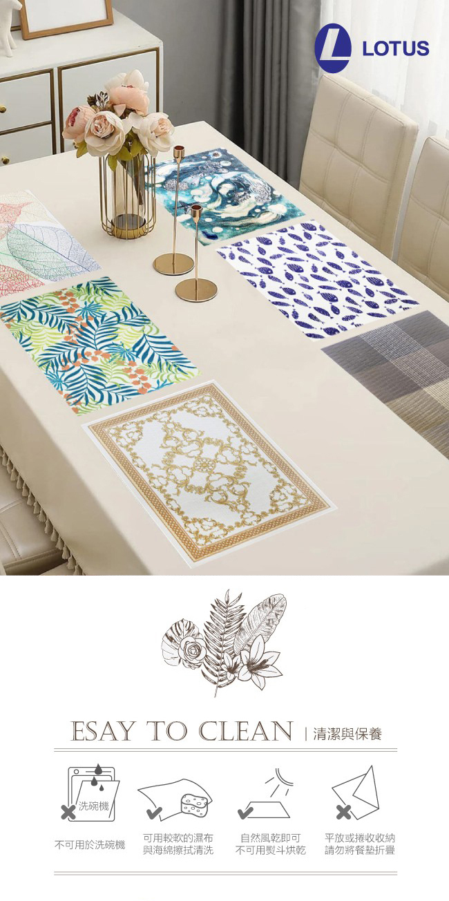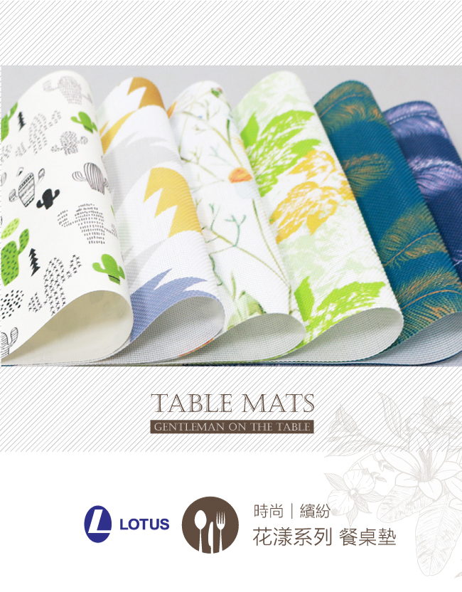 LOTUS致力於發展提高生活品質的產品,設計出歐風雅致的時尚餐墊,繽紛圖案豐富了用餐氛圍,裝飾了餐桌,精緻了品味,替生活增添了時尚饗宴。