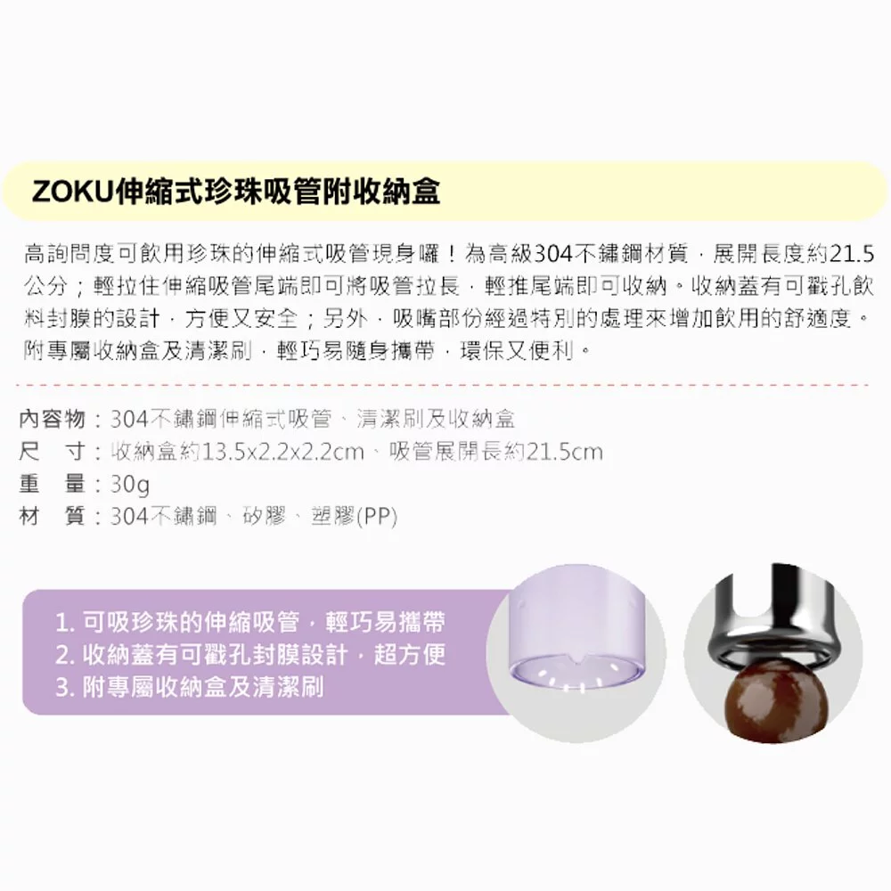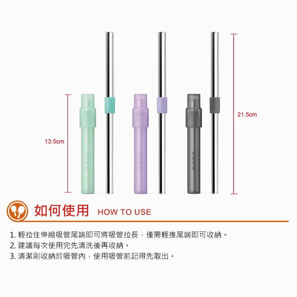 高詢問度可飲用珍珠的伸縮式吸管現身囉!為高級304不鏽鋼材質,展開長度約21.5公分;輕拉住伸縮吸管尾端即可將吸管拉長,輕推尾端即可收納。收納蓋有可戳孔飲料封膜的設計,方便又安全;另外,吸嘴部份經過特別的處理來增加飲用的舒適度。附專屬收納盒及清潔刷,輕巧易隨身攜帶,環保又便利。