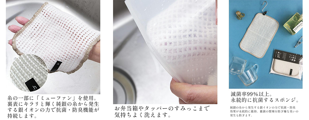 銀離子的力量是抗菌並抑制細菌的生長,能防止難聞的氣味。由於線本身是純銀製成的,因此即使反覆洗滌和漂白後功效也不會降低。銀是一種高度安全的物質,也用於銀器和食品添加劑。因為它是柔和的白色,所以在廚房或任何環境都很好搭配。布本身採用兩層結構,觸感很薄所以洗起來很服貼,可以徹底清潔窄玻璃杯的底部和便當盒的角落,而且乾得快,透氣性好又衛生。